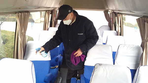 公司為在崗員工發(fā)放了口罩、噴壺、消毒酒精等防護(hù)用品,每日對(duì)各工作場(chǎng)所、班車、車庫(kù)、電梯、宿舍等進(jìn)行定點(diǎn)消毒。
