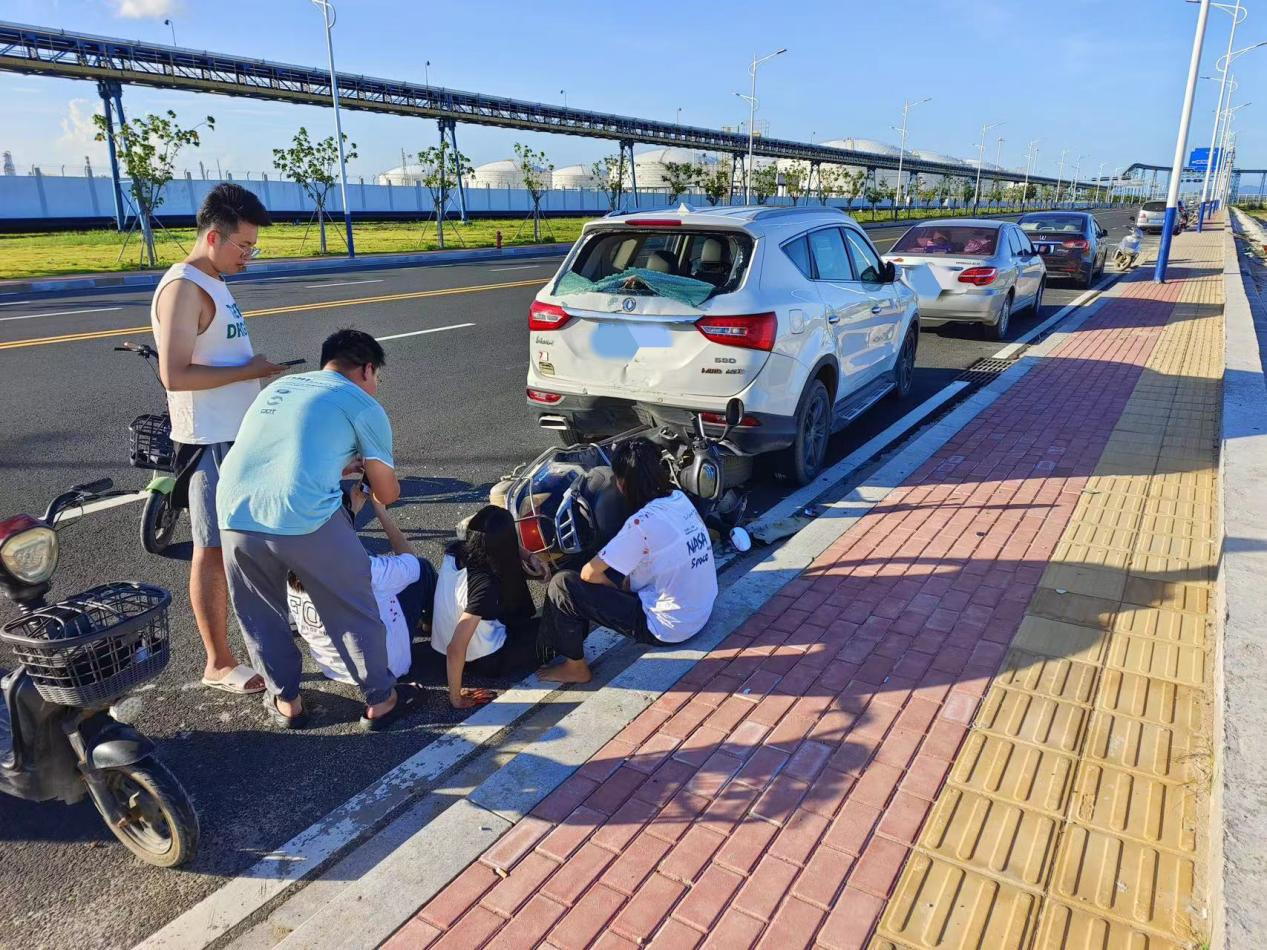 近日,在大南海石化工業(yè)區(qū)環(huán)海南路發(fā)生一起交通事故,兩位年輕人的暖心行為引起了廣泛關(guān)注。據(jù)了解,7月24日下午15時(shí)許,一輛電動(dòng)摩托車撞上了停放在路邊的小汽車,三位女孩受傷,其中,兩名女孩傷勢嚴(yán)重,躺在地上無法動(dòng)彈。就在這時(shí),兩位年輕人跑了過來,向其中一位傷勢較輕的女孩了解具體情況,對(duì)另外兩位女孩子進(jìn)行安撫陪伴,并聯(lián)系小汽車車主。此時(shí),另一位好心市民也跑過來幫忙,撥打了110和120。兩位年輕人一直陪伴在三位女孩身邊,直至救護(hù)車將她們送到醫(yī)院治療才離去。