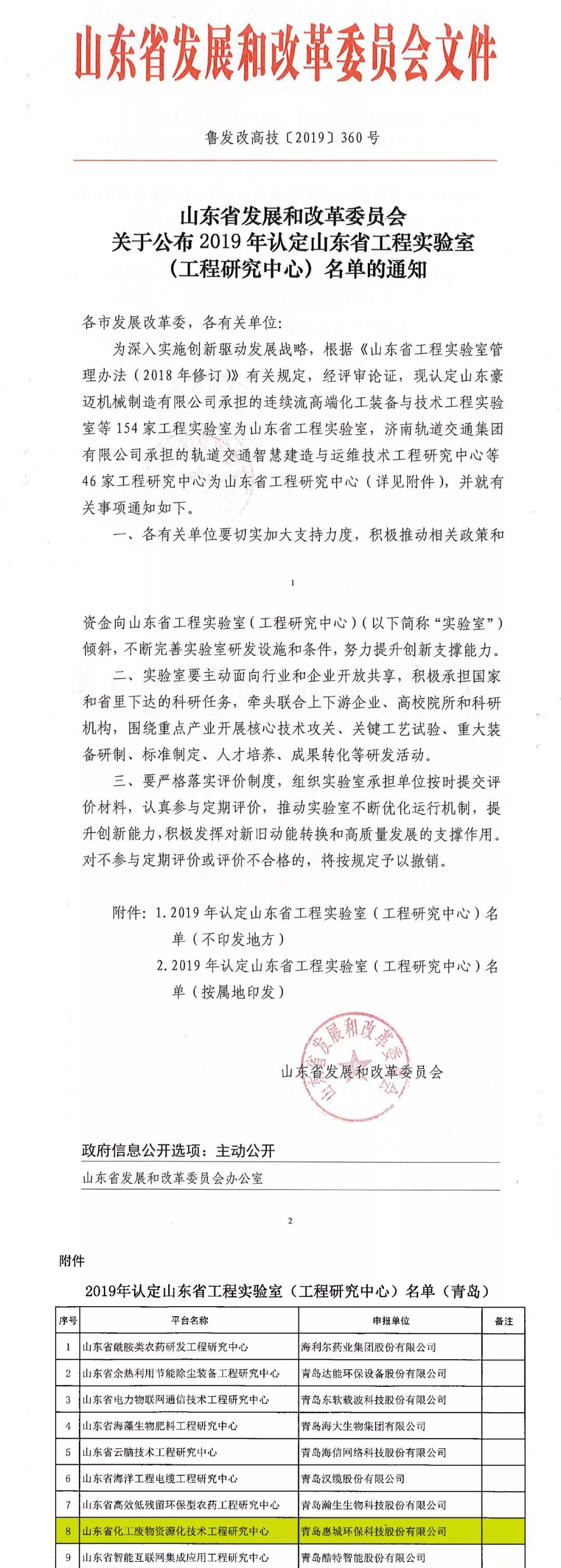 日前,根據(jù)山東省發(fā)展和改革委《關(guān)于公布2019年認(rèn)定山東省工程實(shí)驗(yàn)室(工程研究中心)名單的通知》(魯發(fā)改高技〔2019〕360號)發(fā)布文件,我公司申報的省級工程研究中心獲批并被認(rèn)定為山東省化工廢物資源化技術(shù)工程研究中心。